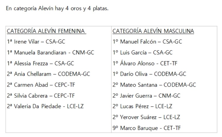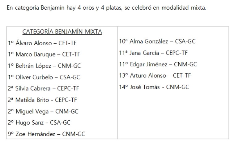CAMPEONATO DE CANARIAS 23/03/2025 BENJAMÍN, ALEVÍN E INFANTIL CAMPEONATO CANARIAS INFANTIL 2024.2025 FEM CLASIFICACION FINAL 23.03.2025Descarga CAMPEONATO CANARIAS INFANTIL 2024.2025 FEM TABLAS 23.03.2025Descarga CAMPEONATO CANARIAS INFANTIL 2024.2025 FEM POULES 23.03.2025Descarga CAMPEONATO CANARIAS INFANTIL 2024.2025 FEM CLASIFICACION POULES 23.03.2025Descarga CAMPEONATO CANARIAS INFANTIL 2024.2025 MASC CLASIFICACION FINAL 23.03.2025Descarga CAMPEONATO CANARIAS INFANTIL 2024.2025 MASC TABLAS 23.03.2025Descarga CAMPEONATO CANARIAS INFANTIL 2024.2025 MASC POULES 23.03.2025Descarga CAMPEONATO CANARIAS INFANTIL 2024.2025 MASC CLASIFICACION POULES 23.03.2025Descarga RESULTADOS CAMPEONATO DE CANARIAS 2024/2025 ALEVÍN TORNEO 23/03/2025 CAMPEONATO CANARIAS ALEVIN FEM POULES 23.03.2025Descarga CAMPEONATO CANARIAS ALEVIN FEM CLASIFICACION POULES 23.03.2025Descarga CAMPEONATO CANARIAS ALEVIN MASC POULES 23.03.2025Descarga CAMPEONATO CANARIAS ALEVIN MASC CLASIFICACION POULES 23.03.2025Descarga RESULTADOS CAMPEONATO DE CANARIAS 2024/2025 BENJAMÍN TORNEO 23/03/2025 CAMPEONATO CANARIAS BENJAMIN MIXTO POULES 23.03.2025Descarga CAMPEONATO CANARIAS BENJAMIN MIXTO CLASIFICACION POULES 23.03.2025Descarga